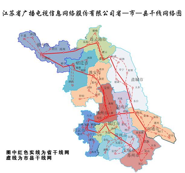 江蘇省廣播電視傳輸網(wǎng)絡(luò)由省-市-縣三級(jí)網(wǎng)絡(luò)組成,覆蓋全省13個(gè)省轄市、66個(gè)縣(市)、967個(gè)鄉(xiāng)鎮(zhèn),共2500萬(wàn)戶家庭,并連接了眾多企、事業(yè)單位及商務(wù)樓宇,具備了全程全網(wǎng)、高速雙向的信息服務(wù)能力。