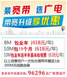 廣電寬帶-- 以速度和內容取勝。帶寬持續升級,步入百兆光速時代,以豐富多彩的內容,全力為用戶奉獻網絡高速優質、價格實惠的家庭寬帶服務產品。