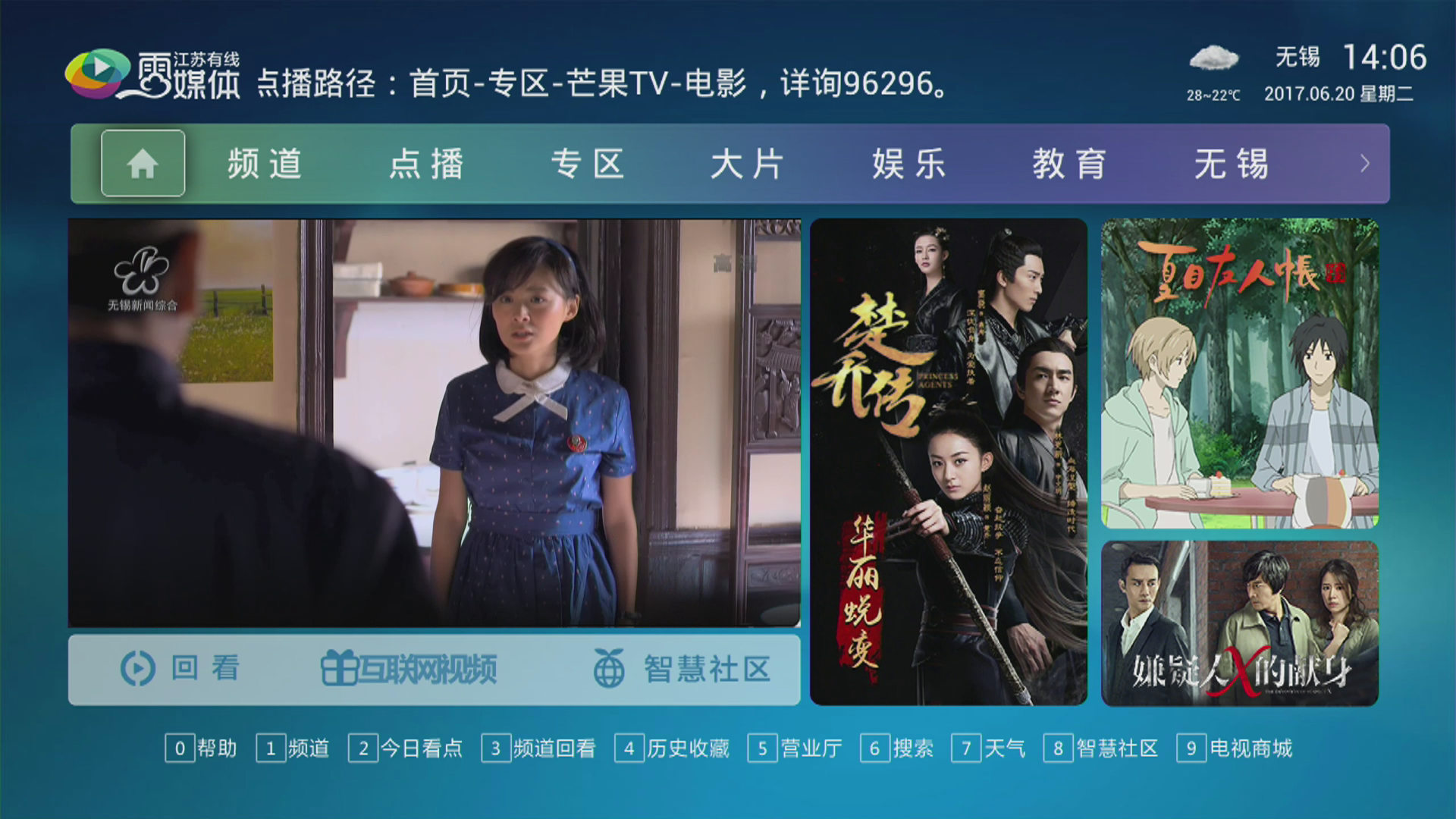 互動(dòng)電視是江蘇廣電網(wǎng)絡(luò)無錫分公司為用戶提供的集合視頻點(diǎn)播、節(jié)目回看、資訊服務(wù)等一系列內(nèi)容的高品質(zhì)有線電視服務(wù)。互動(dòng)電視打破了傳統(tǒng)的“你播我看”的電視收看方式,用戶可以通過點(diǎn)播、回看等功能實(shí)現(xiàn)與電視的互動(dòng)。互動(dòng)電視具備電視節(jié)目頻道更多,圖像質(zhì)量更高,音質(zhì)效果更好,收視方式更新,節(jié)目播放時(shí)間更長等諸多優(yōu)勢,能為用戶創(chuàng)造更加自由、精彩的數(shù)字電視生活。