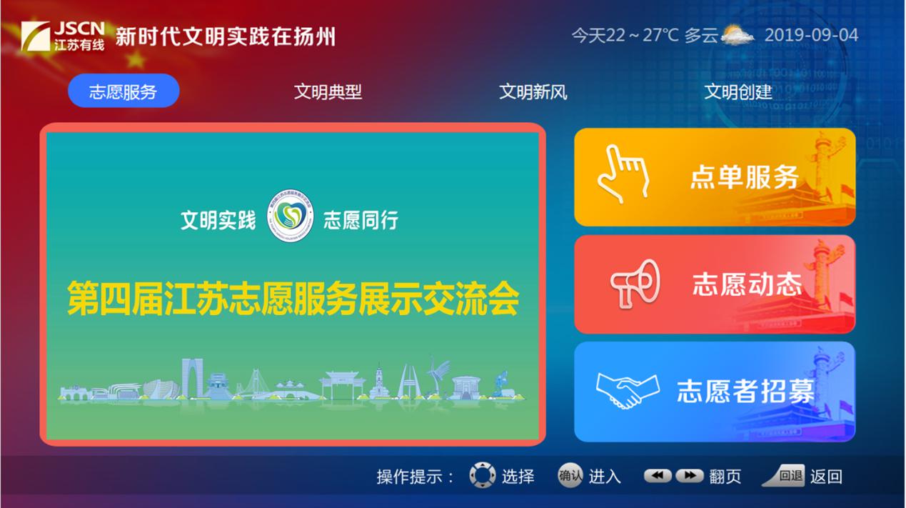 在揚州舉行的第四屆江蘇志愿服務展示交流會上,由揚州市委宣傳部(文明辦)與江蘇有線揚州分公司聯合打造的“新時代文明實踐在揚州”電視互動平臺亮相志交會揚州館。